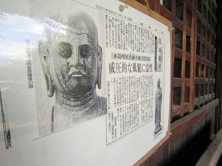 弘仁寺本堂の東側に建つ明星堂。弘法大師空海作と伝わる重文の仏像が安置されています。その名も明星菩薩立像。明星堂に貼られていた明星菩薩立像の写真。「威圧的な風貌に霊性」と題されていますね。